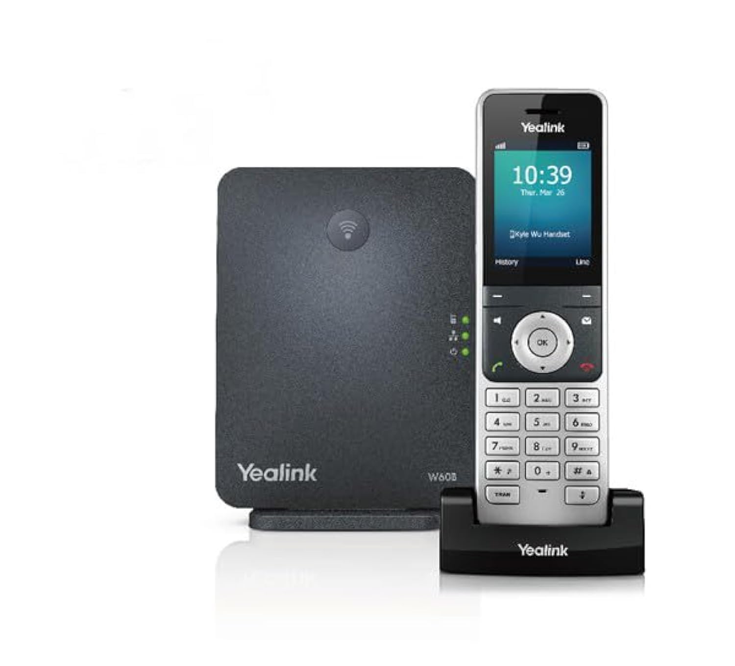 الهاتف يالينك W56H مزود بشاشة ملونة مقاس 2.4 بوصة وبطارية قوية تدوم حتى 30 ساعة مكالمات و400 ساعة في وضع الاستعداد. بينما تضمن القاعدة W60B أداءً عاليًا مع دعم إيثرنت جيجابت وPoE لسهولة التركيب.